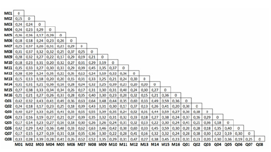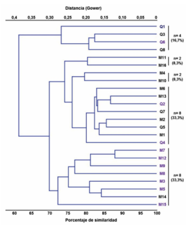 A partir de algoritmo de Gower (gower similarity index), se procedió a analizar las distancias morfométricas entre las poblaciones que forman parte de este estudio (ver figura 3). Al ubicar ambas muestras procedentes de poblaciones diferentes en cuanto a localidad geográfica, temporalidad y correlacionarlas en base a la totalidad de las variables contempladas en la investigación, se determinó que en su conjunto conforman un grupo con un 61% de similaridad, referente a los patrones morfológicos y morfométricos estudiados. El análisis deriva la conformación de 3 grupos A (grupo Quíbor), B (grupo conformado por muestras de Mucuchíes y Quíbor) y C (Mucuchíes), cuya cercanía se aproxima altamente desde el punto de vista biológico.