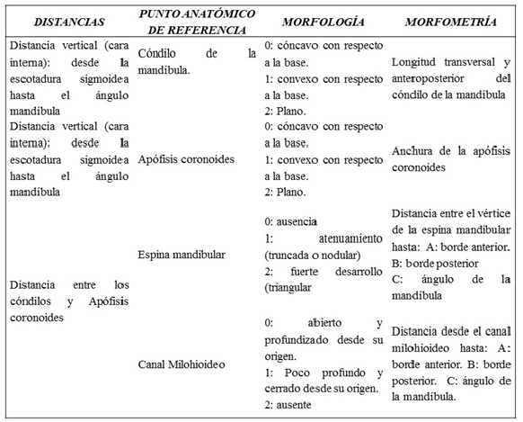 Primeramente, se determinó el sexo por medio de métodos morfológicos y morfométrico. Los puntos anatómicos utilizados desde el punto de vista morfológico fueron los cóndilos de la mandíbula, la apófisis corónides, la espina mandibular o de Spix y el canal milohiodeo, y entre estos se establecieron las medidas con diferentes puntos de referencia (ver tabla 1). Ambos grupos se discriminaron en la rama mandibular por solo un operador, de acuerdo a sus rasgos morfológicos, estudiados con visión directa y lupa estereoscópica con relación a los patrones morfológicos establecidos y las mediciones fueron realizadas con un vernier calibrado digital marca Truper®, en una escala expresada en milímetros (mm), bajo los criterios preestablecidos (ver tabla 1).