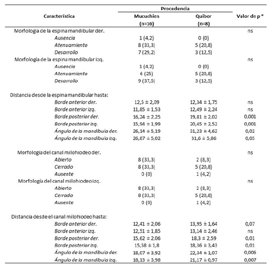 Elaboración propia.Así mismo, en las distancias establecidas desde la espina mandibular hacia los diferentes puntos delimitados en la rama mandibular, se presentan diferencias estadísticamente significativas en relación al borde posterior de la rama (p=0,001) y ángulo de la mandíbula (p=0,05) entre las poblaciones evaluadas. En cuanto al canal milohiodeo, las distancias expresaron significancia estadística con respecto a los tres límites definidos en la rama de la mandíbula, la distancia entre el canal y el borde anterior (p= 0,07) la distancia hacia el borde posterior (p=0,001) y la medición del canal con relación al ángulo de la mandíbula (p=0,01), siendo mayores las dimensiones en la población del Valle de Quibor con respecto a la población colonial de Mucuchíes (Tabla 2).