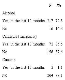 Table 1 shows the prevalence of drug use by people in the sample in the last year. The most reported drug consumed in this period is alcohol, with 79.8% of people, with respect to marijuana, it was consumed by 26.6% and cocaine was the least consumed drug, with 1.1% in the period mentioned above. Regarding the above, it is important to clarify that within the results of the measurements there were participants who used the study substances individually or concomitantly, so the sum between the percentages is 106.4%. It should also be noted that given the circumstance that in the measurement of drug use in the population studied, as a statistical data, the use of drugs was ever measured in life, but not in the last year, this means that there is a percentage of the population that is not taken into account and that in the sum of the percentages the result is less than 100%.