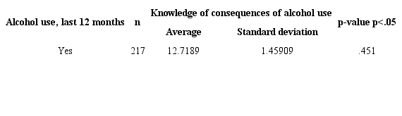 Table 2 shows the results of the T-test to examine the associations between the results of the knowledge score of consequences and alcohol use among students who used alcohol in the last 12 months, in the variables related to “Knowledge of consequences”, Where it is identified that there is no significant association between the variables, where a score was obtained on the knowledge of the consequences of 12.7 of a possible maximum of 14.