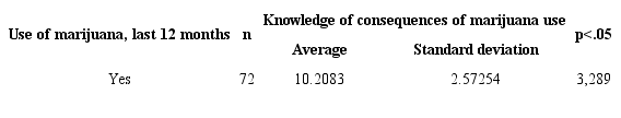 When measuring the relationship between drug use and knowledge of its consequences, using the measurement of the T-test, to determine if there are significant differences between students who have used drugs and those who have not, in the last 12 months before completing the questionnaire, in the mean of “knowledge of consequences”, as a result, the measurement of two tails (2-tailed), in all the comparisons results in more than 0.05. From the above, a statistically significant difference cannot be established between knowledge of the consequences and the use of drugs. Therefore, the hypothesis: “The knowledge of consequences on the use of alcohol, marijuana and cocaine will be associated with a lower use of these substances (alcohol, marijuana and cocaine)”, would be rejected.