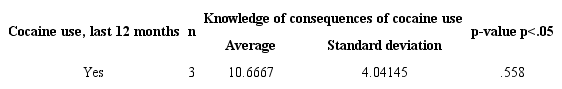 Table 4 shows the results of the T-test, to determine if there are significant differences between students who used cocaine and those who did not, in the last 12 months. According to the values of “Knowledge of consequences”. It is important to note that according to the T values, the levels of significant difference in the mean of the variable is greater than 0.05 (two tails).