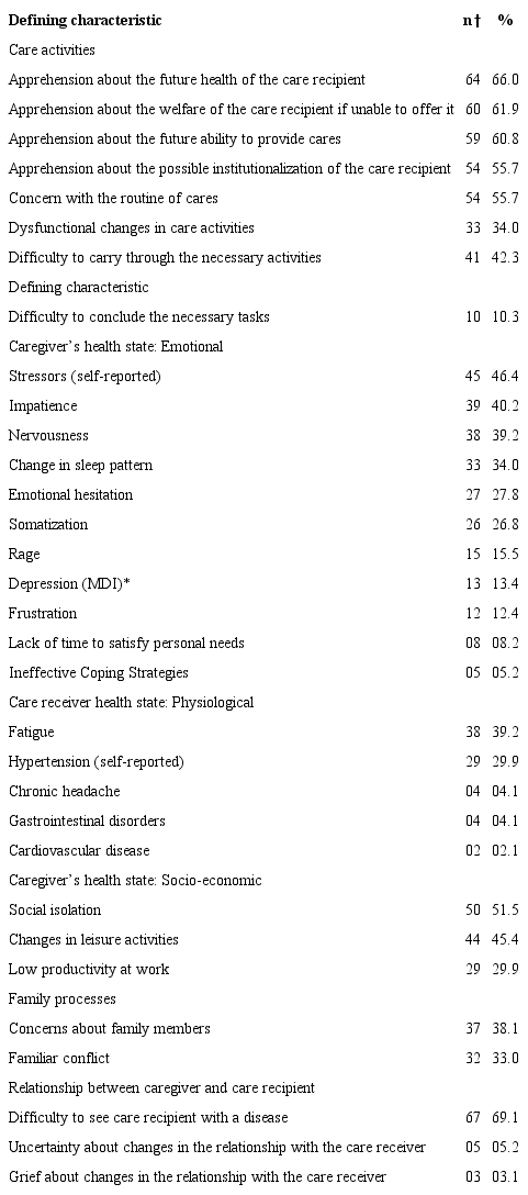 Results: the frequency of the “caregiver role stress” nursing diagnosis found in caregivers was 98.0%. The most common defining characteristics were: difficulty in seeing the care receiver with the disease (69.1%); apprehension about the future health of the care recipient (66.0%); apprehension about the welfare of the care recipient, if the caregiver is unable to offer it (61.9%); apprehension about the future ability to provide care (60.8%); apprehension about the possible institutionalization of the care recipient (55.7%); concern with the routine care (55.7%) and social isolation (51.5%). The related factors most frequently found were: duration of care (92.8%); 24-hour a day care responsibilities (75.3%); dependence (77.3%) and alteration in the cognitive function was (73.2%) in the elderly; physical conditions (73.2%) and codependency of the caregiver (61.9%).