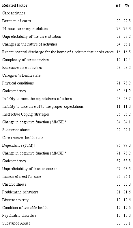 CRS diagnosis has 36 defining characteristics and 54 related factors.11 In this study, all defining characteristics were investigated and we chose to investigate only three categories of related factors - caregiver health state, caregiver health state and care activities - as they are the most frequent in caregiver research.7-8,13 In the caregiver's health state category, the factor related to unrealistic expectations about oneself was not investigated because it is a subjective data that is difficult to measure.