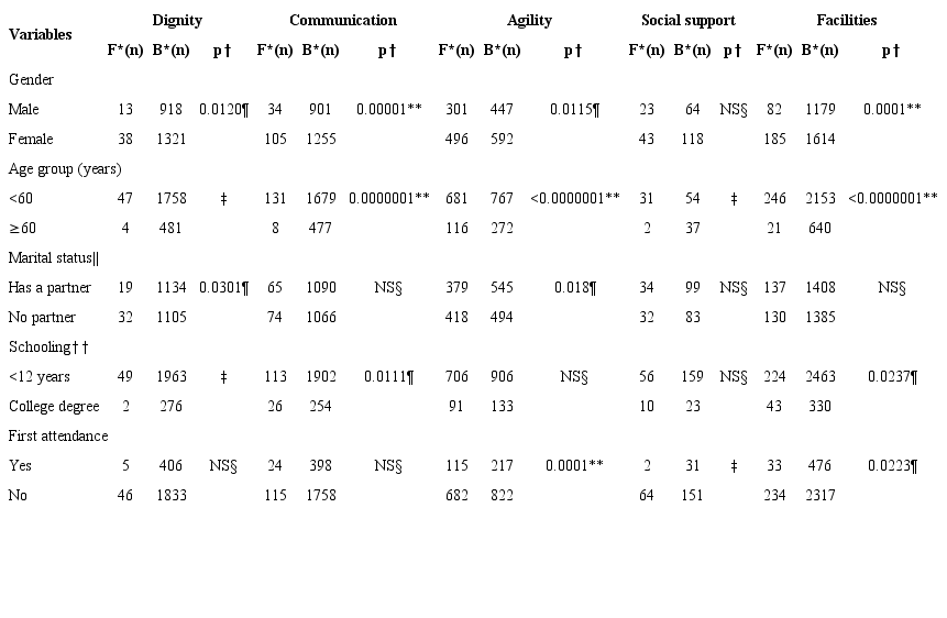 It is worth noting that, although the domains Dignity and Communication constitute the same dimension (respect for people), the findings of the first are presented in Table 1, and those of the second, in Table 2, given the fact that have a distinct response pattern. In Table 1 the possibilities of response are never, rarely, almost always, always and does not apply, while in Table 2: very bad, bad, good, very good and does not apply. For the same reason, the results referring to the Agility domain were presented in Table 1 and those referring to Social Support and Facilities, in Table 2.