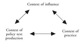O processo de formulação de políticas é considerado como um ciclo contínuo, no qual as políticas são formuladas e recriadas. Os três ciclos principais do ciclo de políticas são o contexto de influência, a produção de texto e o contexto da prática. Esses contextos são intimamente ligados e inter-relacionados, não têm dimensão temporal nem sequencial e não constituem etapas lineares. (op.cit., p. 157)