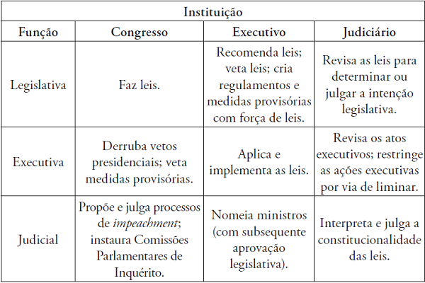 Taylor (2007) esclarece que a forma como os Poderes estão disciplinados na CF/88 indica que há uma sobreposição de suas funções, confor- me se verifica no Quadro 1.