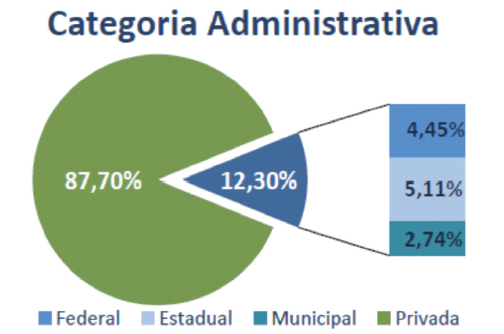 De acordo com o Censo da Educação Superior de 2016 (INEP), verifica-se um aprofundamento do viés privatizante, com a predominância da categoria privada em 87,70% do total de IES, enquanto as públicas registram apenas 12,30%. (Cf. Gráfico 1)