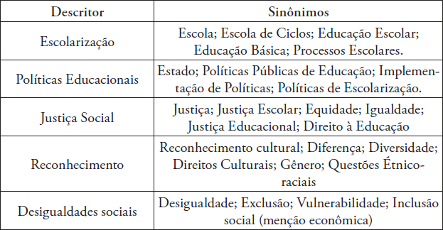 A fim de perscrutarmos como têm sido estudadas as relações entre políticas educacionais e desigualdades sociais, considerando as noções plurais de justiça que organizam as configurações dessa discussão, selecionamos cinco descritores: escolarização, políticas educacionais, justiça social, reconhecimento e desigualdades sociais. Contudo, diante da polissemia conceitual e do pluralismo teórico-metodológico presentes na pesquisa educacional, constatamos a variação de significações e de terminologias pelas quais os pesquisadores nomeiam os fenômenos investigados. Ainda que a pesquisa assumisse contornos artesanais (MILLS, 2009), a cada caso fez-se necessário analisarmos os títulos, resumos, palavras-chave e artigos completos a fim de verificar similaridades ou homologias entre os descritores a priori indicados e as terminologias efetivamente utilizadas.