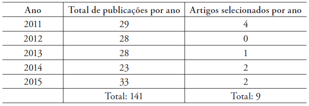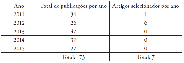 A revista Educação & Sociedade (Tabela 2) publicou 173 artigos, dos quais apenas 7 foram selecionados pela sua compatibilidade com os descritores e o tema abordado. Em 2011, dos 36 artigos publicados no ano, consideramos relevante apenas um, por abordar como tema a relação da educação e das políticas públicas em meio a uma sociedade com uma demanda maior de capital. No ano de 2012, foram escolhidos 6 artigos, dentre 26 publicados. De certa forma, os 6 artigos abordavam questões relacionadas à diversidade, às desigualdades e às políticas públicas envolvidas no processo escolar. Nos demais anos, de 2013 a 2015, não foi possível encontrar nenhum artigo que fosse correspondente aos descritores, tampouco seus resumos abordavam questões relacionadas à pesquisa.