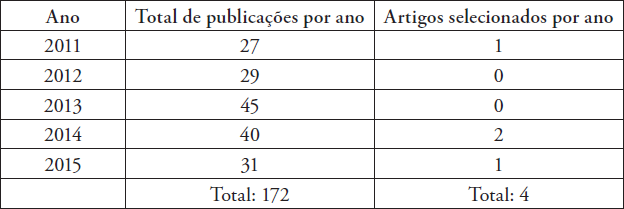 No recorte temporal referente à Revista de Educação Pública, foram publicados 172 artigos científicos. Sob a análise que havíamos adotado, desse total foi possível encontrar 4 trabalhos que apresentassem relação com os descritores, não apenas em suas palavras-chave, mas em seus resumos também. Desses artigos, 1 foi publicado em 2011, 2 em 2014 e 1 em 2015. A Tabela 3 evidencia os dados coletados e descritos.