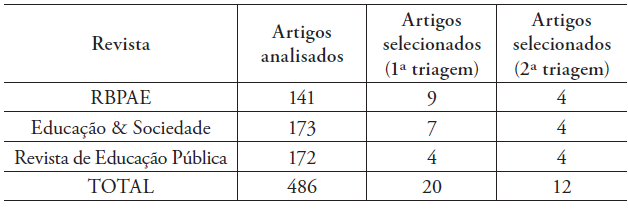 Considerando a atualidade da problemática, optamos pela realização de uma revisão da literatura publicada nos últimos cinco anos (2011-2015) em três periódicos científicos de representatividade nacional. A seleção dos periódicos acompanhou os seguintes critérios: publicação atualizada durante o recorte temporal selecionado; representatividade científi- ca reconhecida pelo sistema Qualis (de avaliação A1 ou A2, segundo a área de Educação); escopo da revista direcionado para estudos sobre políticas educacionais ou sobre as múltiplas dimensões do fenômeno da escolarização; abrangência regional (evitando a concentração regional, ainda que se tratem de revistas nacionais).