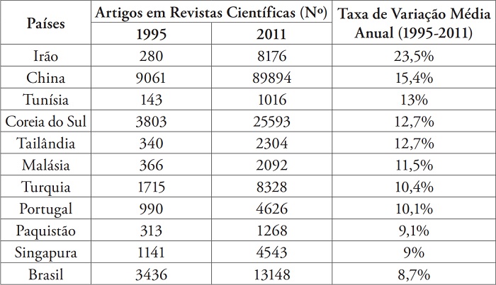 Observe-se os valores do Quadro 12 que apresenta os países cuja produção científica medida pelo número de artigos publicados em revistas científicas conheceu um crescimento anual acima dos 8%.
