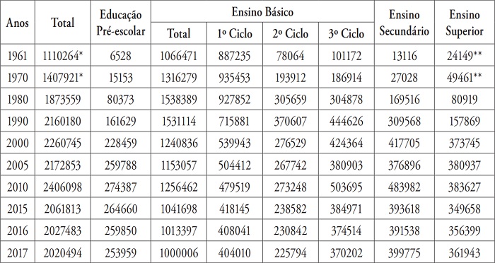 O Quadro 1 apresenta os números que demonstram a natureza ex- plosiva da procura de educação, em todos os níveis educativos, evidenciando a vontade de um país consciente do papel da educação no desenvol- vimento (LOPES, 2013; PSACHAROPOULOS; WOODHALL, 1985).