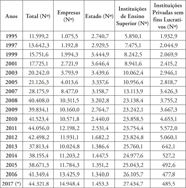 Fonte: Elaboração própria - dados obtidos em Pordata (2018).* PrevisãoO Quadro 7 destaca de forma elucidativa o papel das empresas e das instituições de ensino superior no emprego científico.