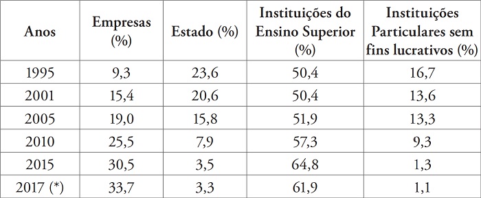 Como se pode verificar, o ensino superior é o maior empregador de investigadores, vendo o seu papel crescendo ao longo do período; inver- samente, o Estado vê o seu papel a diminuir de forma intensa ao mesmo tempo que se assiste ao crescimento do papel que a investigação assume no mundo empresarial.