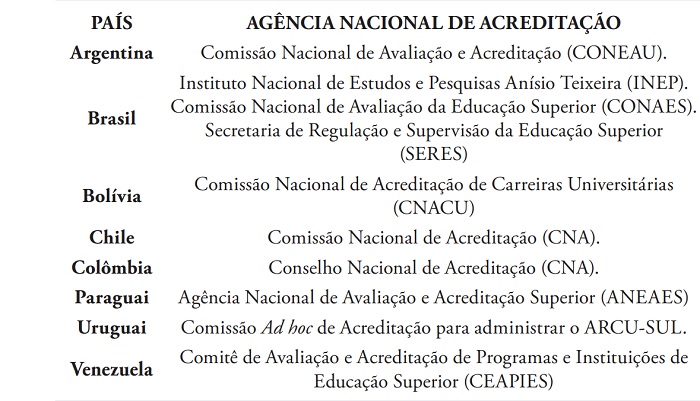 O processo de acreditação regional é gerenciado pela Rede de Agências Nacionais de Acreditação (Rana) que, conforme o Acordo nº 17/2008, possui o papel de coordenar o Sistema, bem como, definir os critérios de avaliação. Para integrar a Rana, cada país indicou uma Agência Nacional de Acreditação (ANA), totalizando oito agências nacionais, con- forme apontado no quadro 1.