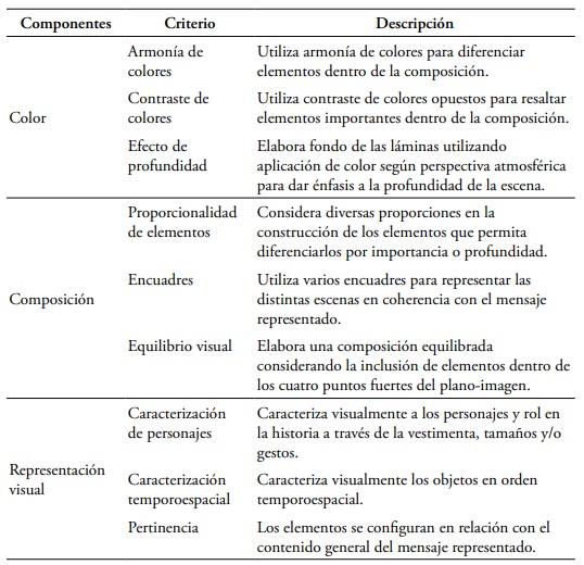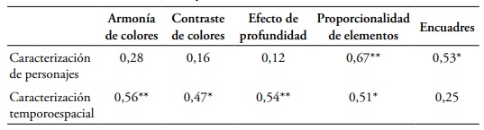 Respecto de la representación visual, en la Tabla 5 se evidencian los índices de correlación entre «Caracterización de personajes», «Caracterización temporo-espacial» y los criterios de «Color» y «Composición».