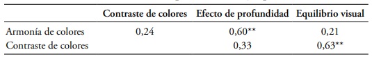 Tal como se informa en la Tabla 5, se observa alta correlación en la mayoría de los factores vinculados a la caracterización del ambiente visual (temporal y espacial), en particular «Armonía de colores» y «Efecto de profundidad» con niveles de significancia al 0,01. Por su parte, «Contraste de colores» y «Proporcionalidad de elementos» correlacionan positivamente de manera bilateral con este tipo de caracterización, aunque disminuyendo el nivel de significancia a 0,05.