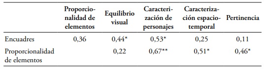 Otro aspecto evaluado en esta ocasión fue la composición, considerando la proporcionalidad de elementos, el uso de variedad de encuadres y el equilibrio visual. Como se observa en la Tabla 4, el criterio «Encuadres» se correlaciona significativamente con «Caracterización de personajes» (r=0,53) y «Equilibrio visual» (r=0,44). Por otro lado, «Proporcionalidad de elementos» se correlaciona significativamente con «Caracterización de personajes» (r=0,67), «Caracterización temporoespacial» (r=0,51) y «Pertinencia» (r=0,46).