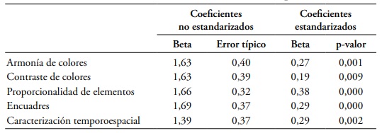 Se observa que «Proporcionalidad de elementos» es la que más aporta a la explicación de la variación del puntaje total (Beta=0,38), seguido por «Encuadres» (Beta=0,29), «Caracterización temporoespacial» (Beta=0,29), «Armonía de colores» (0,27) y «Contraste de colores» (Beta=0,19). Estos resultados se vinculan a los hallazgos de las correlaciones, en que la «Proporcionalidad de elementos» resultaba un aporte a la caracterización, asimismo respecto de la importancia de los «Encuadres» para la «Caracterización de personajes» y «Equilibrio visual».