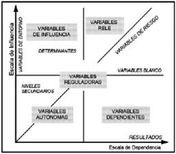 a) Variables determinantes o «influyentes»: son variables muy influyentes y un tanto dependientes. La mayor parte del sistema depende de estas variables. Son las variables más importantes, ya que pueden actuar sobre el sistema dependiendo de cuanto podamos controlarlas.