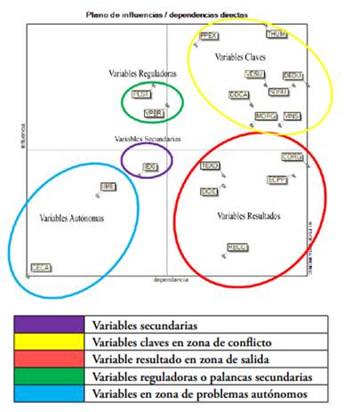 Garza y Cortez (2011) señalan que la herramienta estructural MICMAC busca analizar de manera cualitativa las relaciones entre las variables que componen un sistema dentro de una empresa, organización, sociedad o país. Cabe destacar que esta herramienta ha impactado positivamente en los trabajos investigativos de campo, permitiendo su aplicación para establecer variables de desarrollo en la institución educativa abordada.