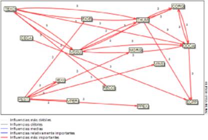 El material anterior muestra la relación establecida entre las variables, todas de acuerdo al impacto de una variable sobre otra; como es percibida por los actores. Las influencias se puntúan de 0 a 3, con la posibilidad de señalar las influencias potenciales (con la letra P):