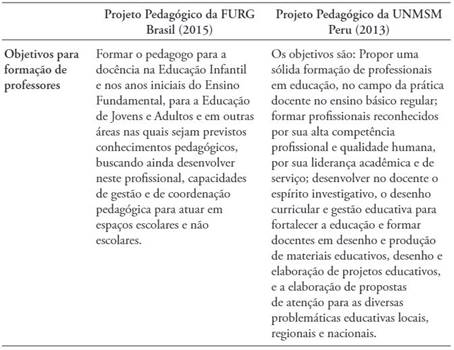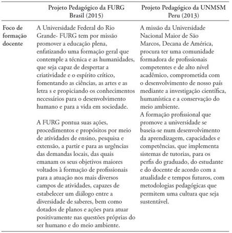 Diante dessas reformas que têm sido implementadas na formação de professores nos países da América Latina, os cursos analisados no Peru e no Brasil não ficam à margem. Nesse sentido, buscamos os projetos político pedagógicos dos cursos de Pedagogia das universidades de UNMSM e da FURG para realizar este estudo.