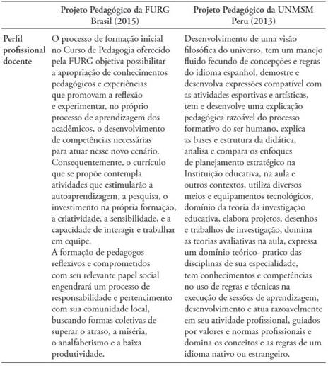 Resumen: En este artículo se presenta un análisis comparativo entre los Proyectos Pedagógicos de los cursos de formación inicial de profesores de la Facultad de Educación de la Universidad Nacional Mayor de San Marcos - UNMSM (Perú) y de la Universidad Federal do Rio Grande - FURG (Brasil). La investigación desarrollada fue cualitativa, realizada por medio de análisis documental. Fueron analizados documentos de las dos universidades participantes de la investigación, procurando verificar aspectos como los objetivos para la formación de profesores, el enfoque de formación, el perfil profesional, la duración de los cursos, las disciplinas desarrolladas y la realización de prácticas preprofesionales. Después del análisis, es posible percibir que ambos proyectos pedagógicos procuran la formación de profesionales comprometidos con el aprendizaje para que sean líderes en educación con iniciativa y creatividad, con una visión integral del sector educativo y una sólida formación teórico-práctica.