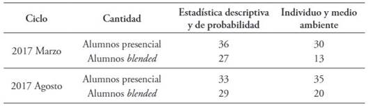 El muestreo fue intencional y no probabilístico. Se eligieron esos grupos por los profesores. Ambos grupos, tanto el blended como el presencial tenían el mismo docente. Esto se hizo con la intención de eliminar al docente como variable que pueda influir en los resultados de la investigación. La muestra con la que se trabajó mantenía la misma proporción entre hombres y mujeres y una edad media similar a aquella de la población general. En la siguiente tabla se detallan las secciones y la cantidad de alumnos que estudiaba en cada una de las modalidades. Cabe mencionar que esta es la muestra final con la que se trabajó.