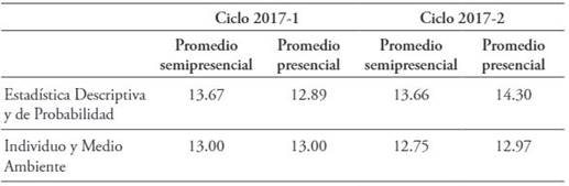 La primera conclusión a la que se puede llegar con este trabajo es que no existen diferencias significativas en cuanto a las notas finales de los alumnos de ambos cursos estudiados, Estadística Descriptiva y Probabilidades e Individuo y Medio Ambiente. Ello está en concordancia con lo descrito en la literatura. Estos resultados nos permiten seguir apostando por las modalidades semipresenciales, puesto que es justo lo que se busca, obtener el mismo logro. Diferentes caminos, pero la misma meta.