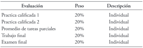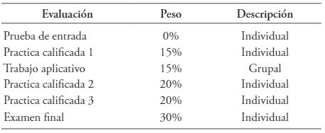 En cuanto a las evaluaciones del curso de Estadística, cabe mencionar que todas las prácticas calificadas tienen la misma estructura. Estas cuentan con dos preguntas teóricas sobre los conceptos correspondientes al tema de la unidad y tres ejercicios prácticos en donde se espera que los alumnos resuelvan las operaciones correspondientes e interpreten los resultados, y el examen final tiene un formato similar al de las prácticas. Mientras que el trabajo grupal es una investigación en donde se les pide a los alumnos una reflexión sobre algún contenido del curso, este trabajo también debe ser expuesto y debatido en clase.