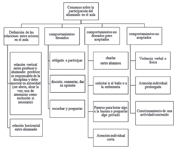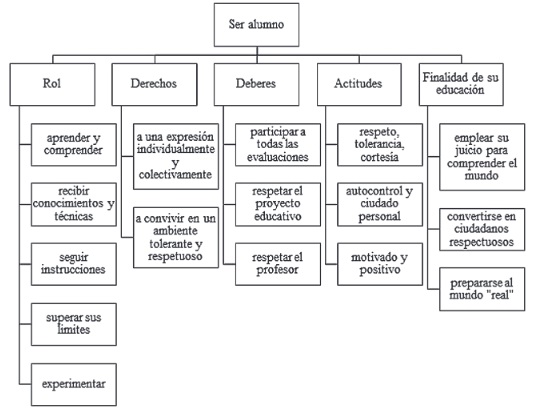 Considerando el primer objetivo de este estudio, emerge del análisis de los documentos institucionales la pauta que enmarca la participación de los alumnos y de las alumnas en clase en función de su rol en el aula, sus deberes, sus derechos, las actitudes que se esperan de ellos y ellas y la finalidad de su educación (ver Figura 1).