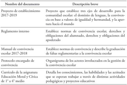 La producción de datos se efectuó por medio del uso de la revisión documental, la entrevista y la observación. Para la revisión documental, el establecimiento educacional cuenta con documentos institucionales que mencionan la participación del alumnado en el establecimiento y un plan de formación ciudadana mediante una asignatura denominada Educación Moral y Cívica cuyo objetivo es entregar a los y las estudiantes las herramientas necesarias para desarrollar y promover la competencia social y ciudadana (Tabla 1).