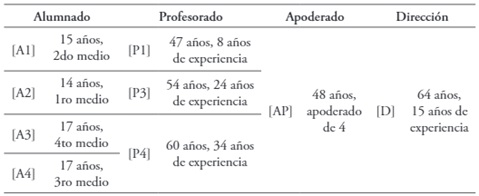 Las entrevistas fueron realizadas a partir de un muestreo de tipo intencional y de conveniencia por ser uno de los autores docente del liceo. En el caso del alumnado, se entrevistaron solamente a los alumnos y las alumnas que se podían observar luego en clase, lo que por conveniencia de acceso a terreno del investigador observando, se limitó a tres aulas de secundaria. Trabajamos con nueve actores escolares (Tabla 2): cuatro alumnos, tres profesores, un apoderado y una persona de dirección, privilegiando así la cualidad de la expresión de cada uno de los sujetos estudiados sobre la cantidad de sujetos. Los ejes temáticos discutidos con los actores escolares han sido los siguientes: i) el rol del alumno y del profesor en el aula actual; ii) las interacciones cotidianas en el aula (aceptables/no aceptables); iii) la comparación/relación entre las interacciones en el aula y las interacciones en el mundo exterior; iv) cómo serían las interacciones entre alumnado y profesorado en un aula ideal. En cada entrevista se firmó un consentimiento informado individual y personal, acompañado de la firma de apoderado cuando necesario, y se aseguró la confidencialidad de los datos obtenidos, en el sentido de garantizar un trabajo que respete los derechos de los participantes en la investigación y los estándares aceptados por la comunidad científica internacional. En caso de ser requerido el material dispuesto por el análisis, puede ser solicitado al autor correspondiente.