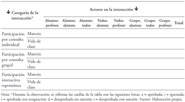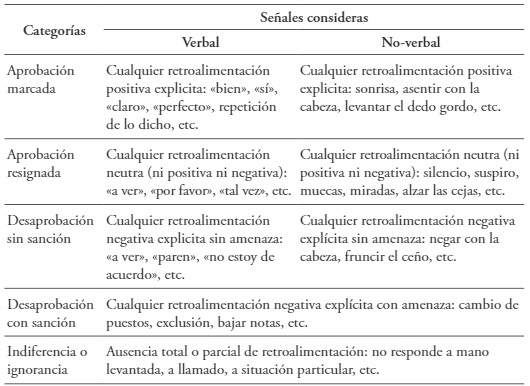 Para la observación, usamos una pauta de participación que permite observar cómo operan las prácticas de participación a través del registro de las interacciones del alumnado según los siguientes criterios: i) si el acto es respuesta a una participación solicitada al grupo (participación por consulta grupal) o a la persona (participación por consulta individual), o si es una participación espontánea (participación interactiva espontanea), inspirándose de las escaleras de participación (Arnstein, 1969; Hart, 1993; Morrow, 2001); ii) si el objeto del acto verbal es el contenido de la lección o la vida de clase; iii) si el acto verbal genera una de las siguientes reacciones de parte del profesor: aprobación marcada, aprobación resignada, desaprobación sin sanción, desaprobación con sanción, o si es ignorado. Las retroalimentaciones verbales y no verbales que se consideraron para cada una de las categorías antemencionadas (ver Tabla 3) no son exhaustivas y dependen en gran parte del contexto y de su interpretación en el momento de ocurrencia.