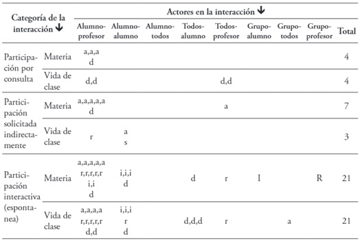 El análisis de la Tabla 5 permite destacar una cantidad importante de participación espontánea en comparación con la participación solicitada por el profesor. Esta participación interactiva espontánea se divide perfectamente entre los asuntos del contenido curricular de la clase (reformulación del vocabulario técnico, explicación de conceptos, etc.) y los asuntos de la vida del aula (lápiz que falta, baños, conversaciones, etc.). Si la cantidad reducida de datos no permite sacar conclusiones relevantes, se puede observar algunas tendencias acerca de las prácticas de participación aprobadas de parte del profesor y las que no se aprueban. Primero, la mayoría de las prácticas de participación entre el alumnado está ignorada, y si no lo está, se desaprueba. En la misma línea, los actos de comunicación de parte de la mayoría de los estudiantes hacia un solo estudiante o hacia el profesor se desaprobaron todas a excepción de una. Se podría deducir que la participación colectiva no está incentivada, al contrario, se tiende a preferir la expresión individual, hacia el profesor, y ojalá sobre el contenido (donde se concentra la mayoría de aprobación en relación los otros tipos de respuestas).