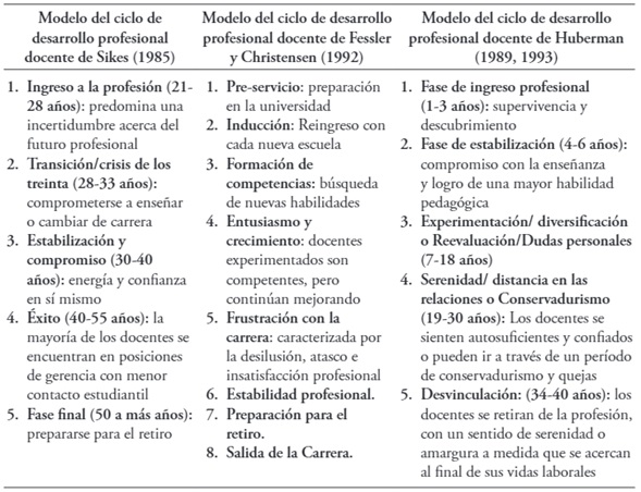 La revisión de la literatura relacionada con las trayectorias profesionales permitió identificar tres modelos de las fases del desarrollo profesional docente, los cuales se resumen en la siguiente tabla: