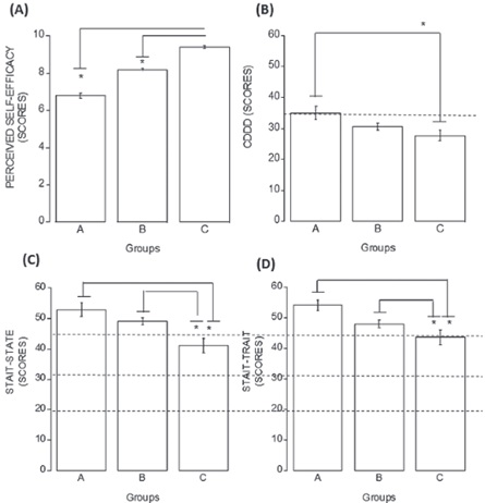 The one-way ANOVA indicated significant differences attributable to the level of perceived self-efficacy in STAI-S scores among the three groups (F 2,111= 8.272, p < 0.001). Students in group A with low perceived self-efficacy had the highest scores in this scale, corresponding to moderate to high anxiety, followed significantly by group B (moderate range anxiety) and finally, group C which obtained the lowest scores, indicating a low level of anxiety. Fig. 1C.
