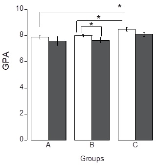 The one-way ANOVA indicated significant differences attributable to the level of perceived self-efficacy in GPA (F 2,111= 4.418, p < 0.01). The significantly lower high school GPA was obtained by students by group A with low self-efficacy (7.9 ± 0.16, p < 0.05), followed by group B with intermediate self-efficacy (8.0 ± 0.08, p < 0.05), while group C obtained the highest high school GPA (8.5 ± 0.13, p < 0.05); see Figure 2.
