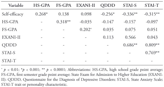 Multiple regression analysis indicated that the predictors explained 43.6% of the variance in self-efficacy (R2 = 0.436, F (5, 108) = 4.197, p < 0.001). The main effect was from the scores obtained on STAI-S (b = -0.0293, t = -3.775, p <0.001), STAI-T (b = -0.0277, t = -3.513, p < 0.001), QDDD (b = -0.0263, t = -2.806, p < 0.006) and the average grade the students obtained during high school education (HS-GPA: b = 0.343, t = 2.942, p <0.004). There was no main effect of Scores obtained in the university entrance exam (EXANI-II: b = 0.0118, t = 1.050, p = 0.296) and first semester grade point average (FS-GPA: b = 0.0830, t = 1.471, p = 0.144). Taken together, the results of the regression analysis indicated that students with high levels of anxiety have low levels of self-efficacy, while high academic performance during high school predicts a good level of academic self-efficacy when entering university, but not during the university.