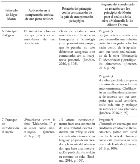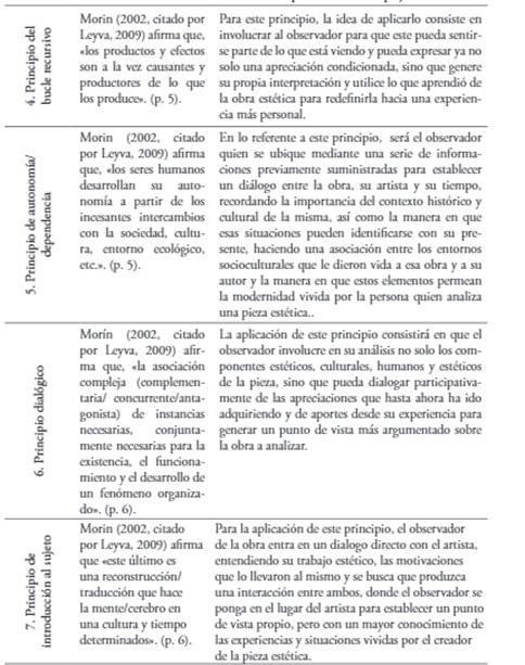 Por consiguiente, en la Tabla 1 se podrá apreciar la integración entre los principios del paradigma de la complejidad de Morin (2001) y su aplicabilidad al análisis y apreciación de una obra estética con el fin de llegar a la elaboración de una guía de interpretación pedagógica que dé cuenta de la aplicación de un análisis cualitativo hermenéutico y que tenga como base una lectura interpretativa de una obra de arte.