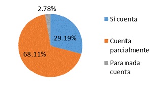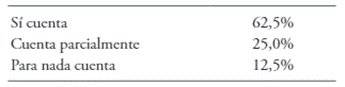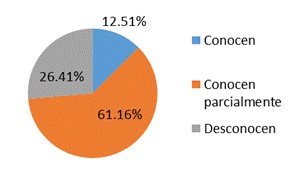 También se les cuestionó sobre si conocían la política institucional en materia de equidad, a lo que un 25% de los académicos encuestados aceptaron que para nada conocen la política institucional en materia de equidad, 37,5% asegura conocerla parcialmente y solo el 37,5% afirma conocer en su totalidad la política institucional en el manejo de equidad. En lo que se refiere al otro estamento (ver figura 5), solo el 12,51% de la población estudiantil encuestada expresa conocer dicha política institucional. Lo anterior se relaciona de manera porcentual con el hecho de que solo el 16,68% conocía a los responsables en materia de equidad, es decir, el desconocimiento de los responsables coincide con el desconocimiento de la política institucional.