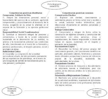 El análisis de resultado se realiza haciendo una triangulación entre las competencias genéricas institucionales tanto identitarias y comunes, con la ficha de proyecto social (FPS), testimonios de estudiantes (TE) y testimonios de académicos y académicas (TA), teniendo presente el siguiente esquema: