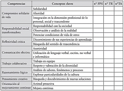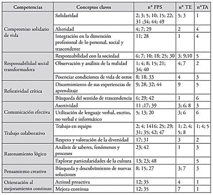 Como se puede apreciar en la tabla, es posible reconocer en FPS, TE y TA que están presentes los conceptos claves de las competencias genéricas, desde lo cual se puede inferir que hubo desarrollo de experiencias de aprendizaje. Las competencias más desarrolladas son el Compromiso solidario de vida, la Responsabilidad social transformadora y el Trabajo colaborativo. Desde el análisis de las unidades de relato se percibe el desarrollo de las habilidades a la cual tributa cada competencia genérica, para ello, se seleccionaron algunos de los relatos más significativos. Así, la competencia de Compromiso solidario de Vida que considera como elementos centrales la solidaridad, la alteridad y la integración personal, social y trascedente (UCSH, 2014b), los y las estudiantes señalaron,