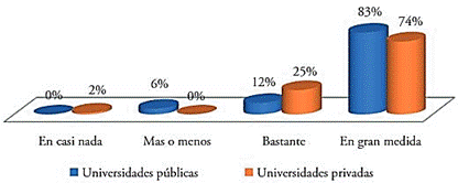 Los resultados exponen una percepción a favor de la necesidad para el diseño de relacionarse con conocimientos de otras disciplinas, apoyada por el 94% de los profesores que laboran en universidades públicas, y por el 98% de aquellos que trabajan en instituciones privadas (ver Figura 1). Cabe destacar que casi un 6% de quienes trabajan en el sector público le da poca prioridad a la acción interdisciplinar en el diseño, frente a un 2% de aquellos que se desenvuelven en el sector privado, prevaleciendo un explícito apoyo a la interdisciplinariedad, lo que debe ser valorada como un punto a favor.