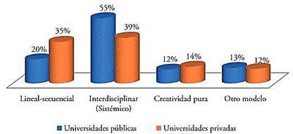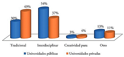 Como se puede observar (ver Figura 2), en las instituciones públicas se encuentra un ligero predominio de la interdisciplinariedad en un 54%, frente a un 30% del modelo tradicional. Con un 13% se ubican distintos modelos, y con un 3% la creatividad pura.