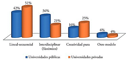 En cuanto a aquellos adscritos a instituciones privadas, en proporciones muy similares que promedian 37%, conciben que prácticamente a la par se emplean los modelos tradicional e interdisciplinar, y en un nivel menor que ronda 13%, ubican la creatividad y otros modelos.